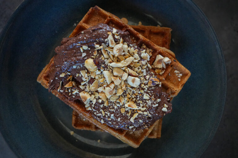 Ces gaufres sont délicieuses avec une fine couche de pâte à tartiner au chocolat et un peu de granola maison pour un supplément de croquant et une touche de saveur de noisette.